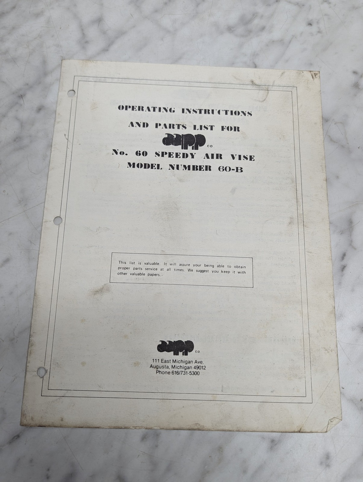 Aapp Operating Instructions Parts List Catalog Manual #60 Speed Air Vise 60-B