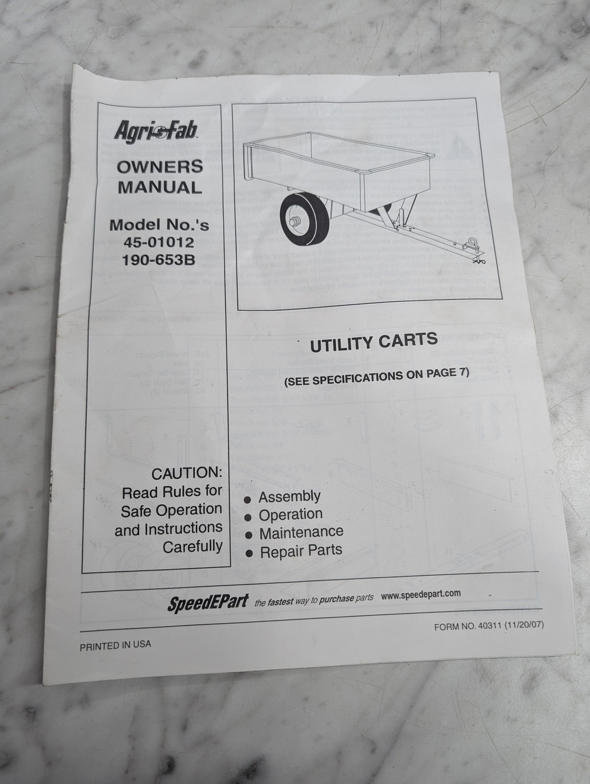 Agrifab Owners Manual Model 45-01012 190-653B Utility Carts Service Parts List