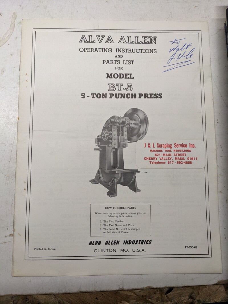 Alva Allen Operating Instruction Service Parts List Manual Model Bt-5 Ton Press