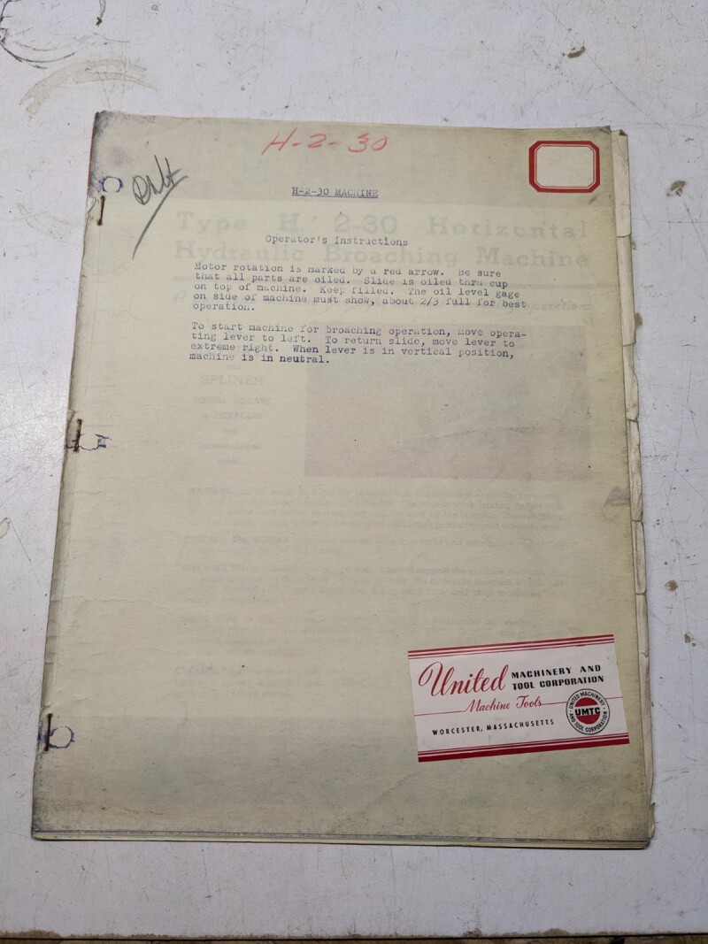 American Broach Machine Type H 2-30 Operator Service Manual Parts List Book 1943