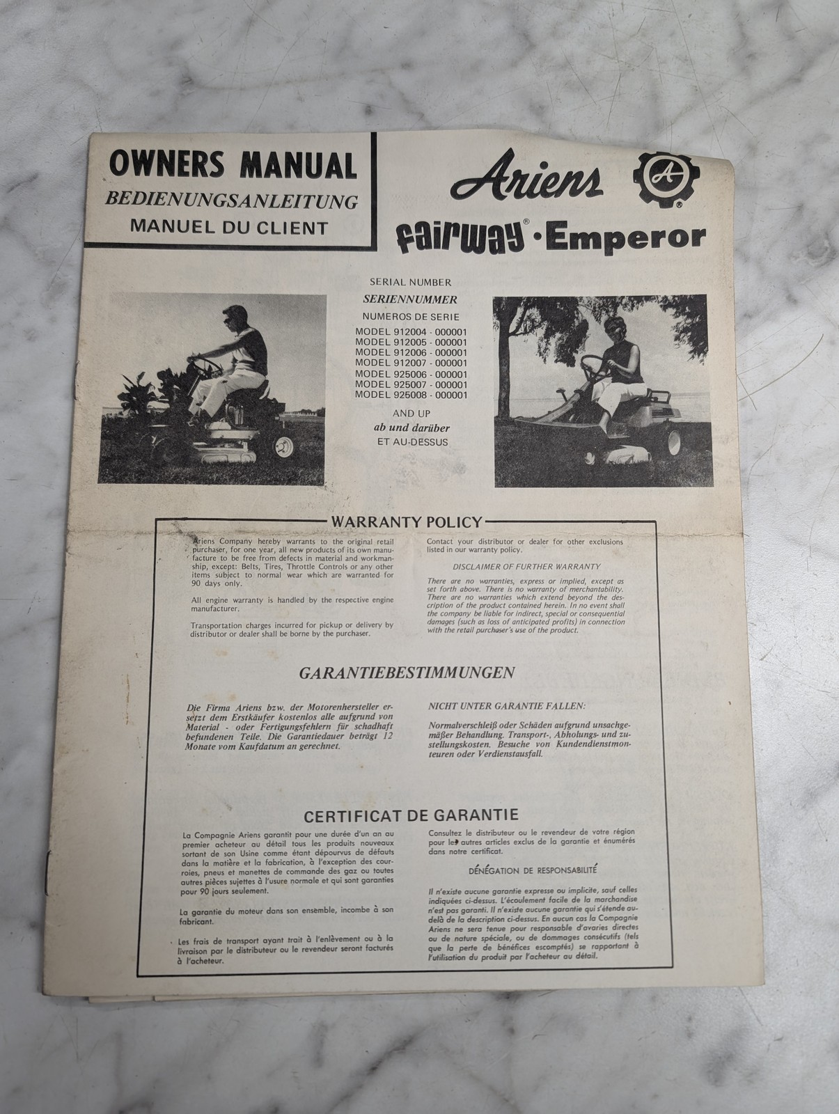 Ariens Fairway Emperor Tractor Operator Owners Manual Feom-73 R1