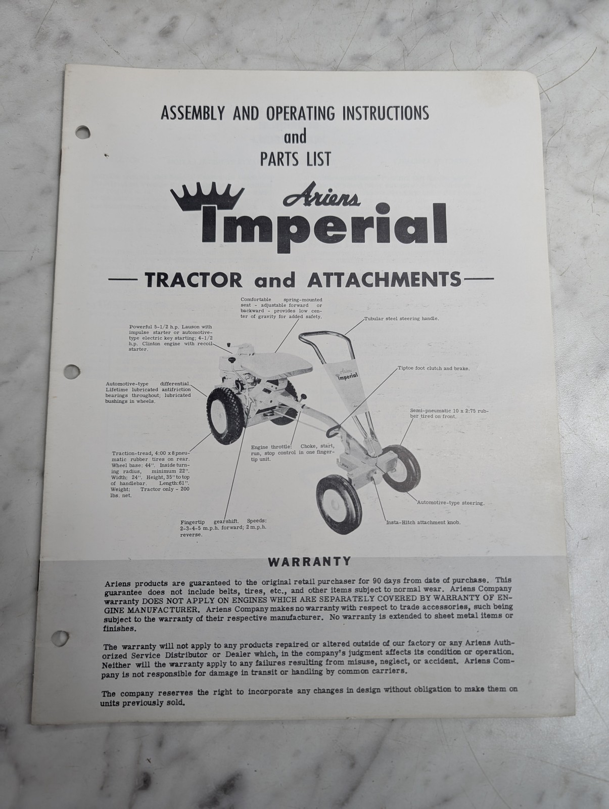 Ariens Imperial Assembly & Operating Instruction & Parts List Manual