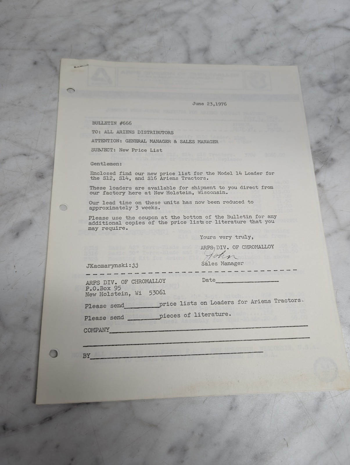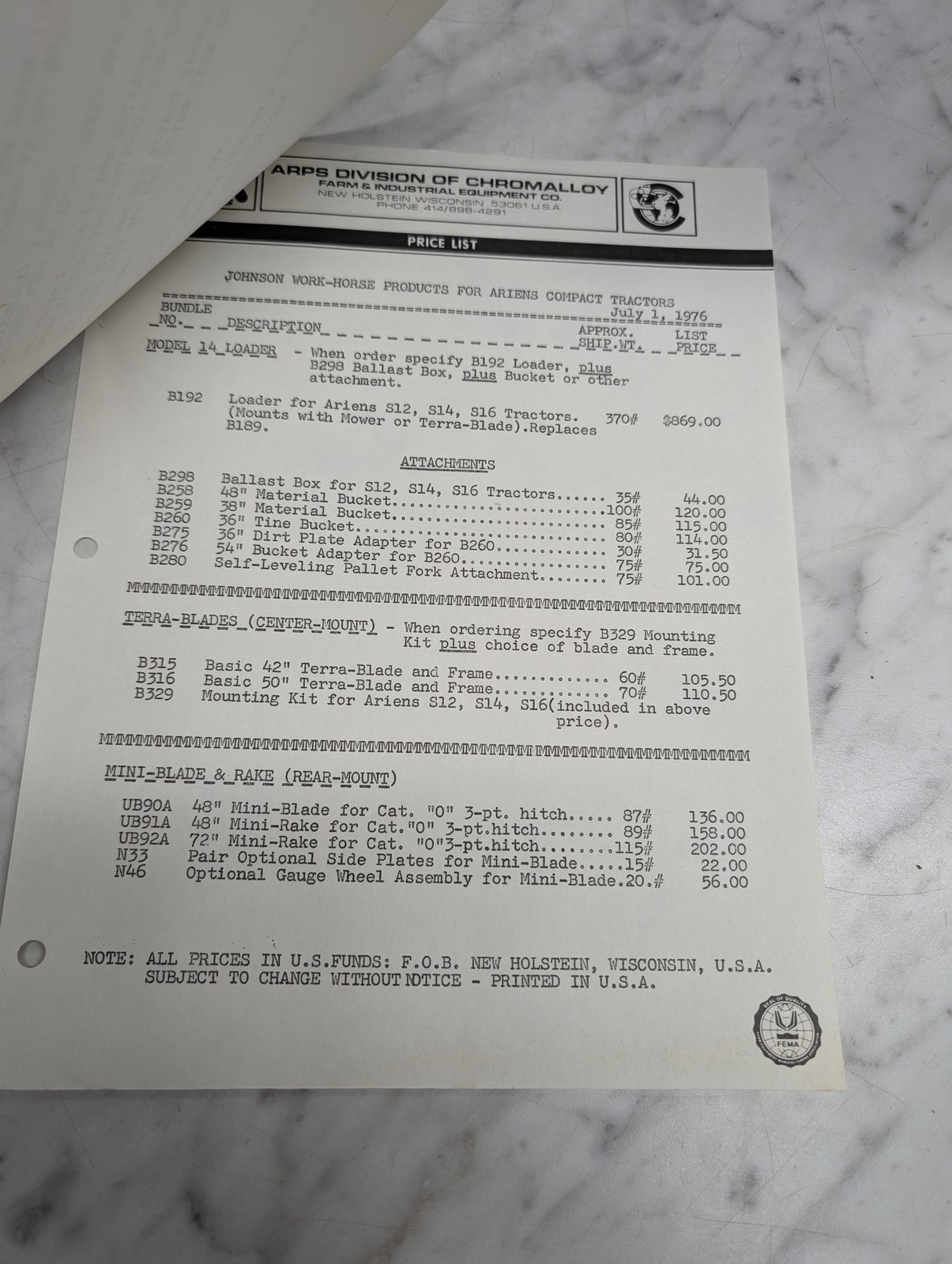 Ariens Model 14 Loader S12 S14 S16 Tractors New Price List June 23 1976