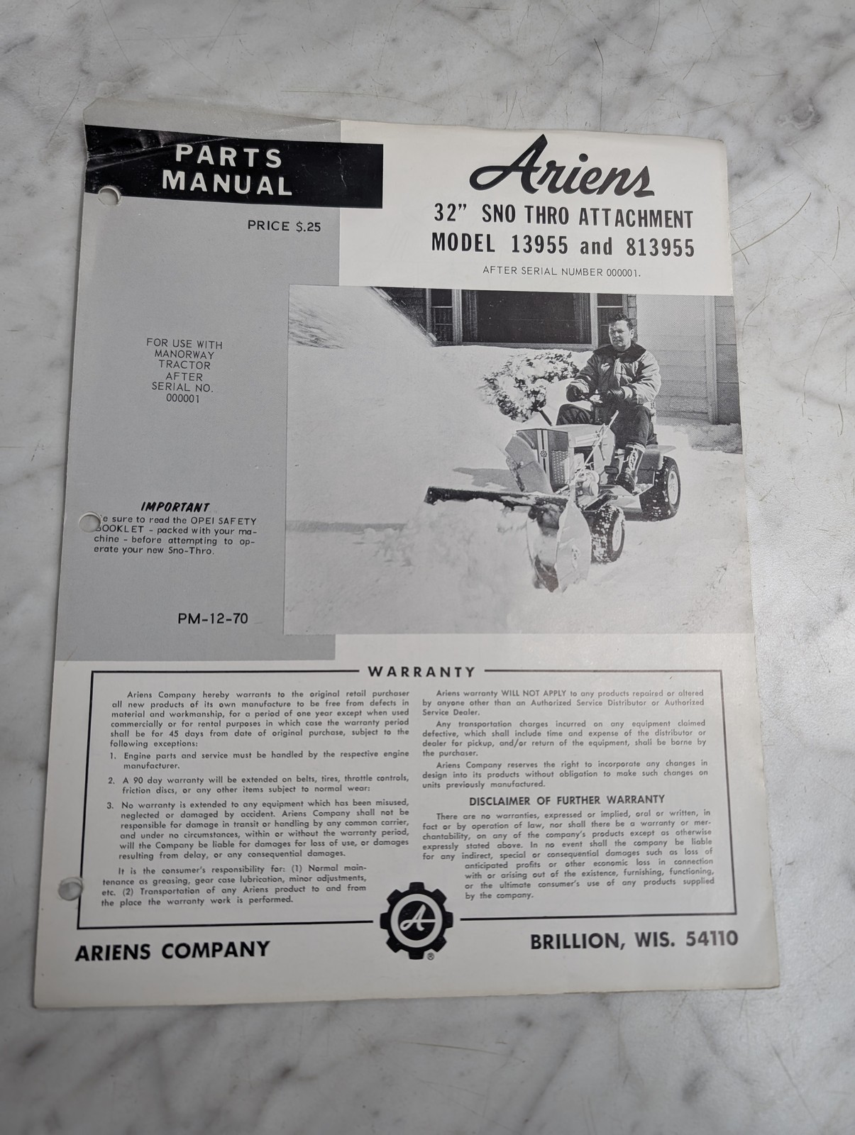 Ariens Parts List Manual Catalog 32” Sno Thro Attachment 13955 813955 Pm-12-70