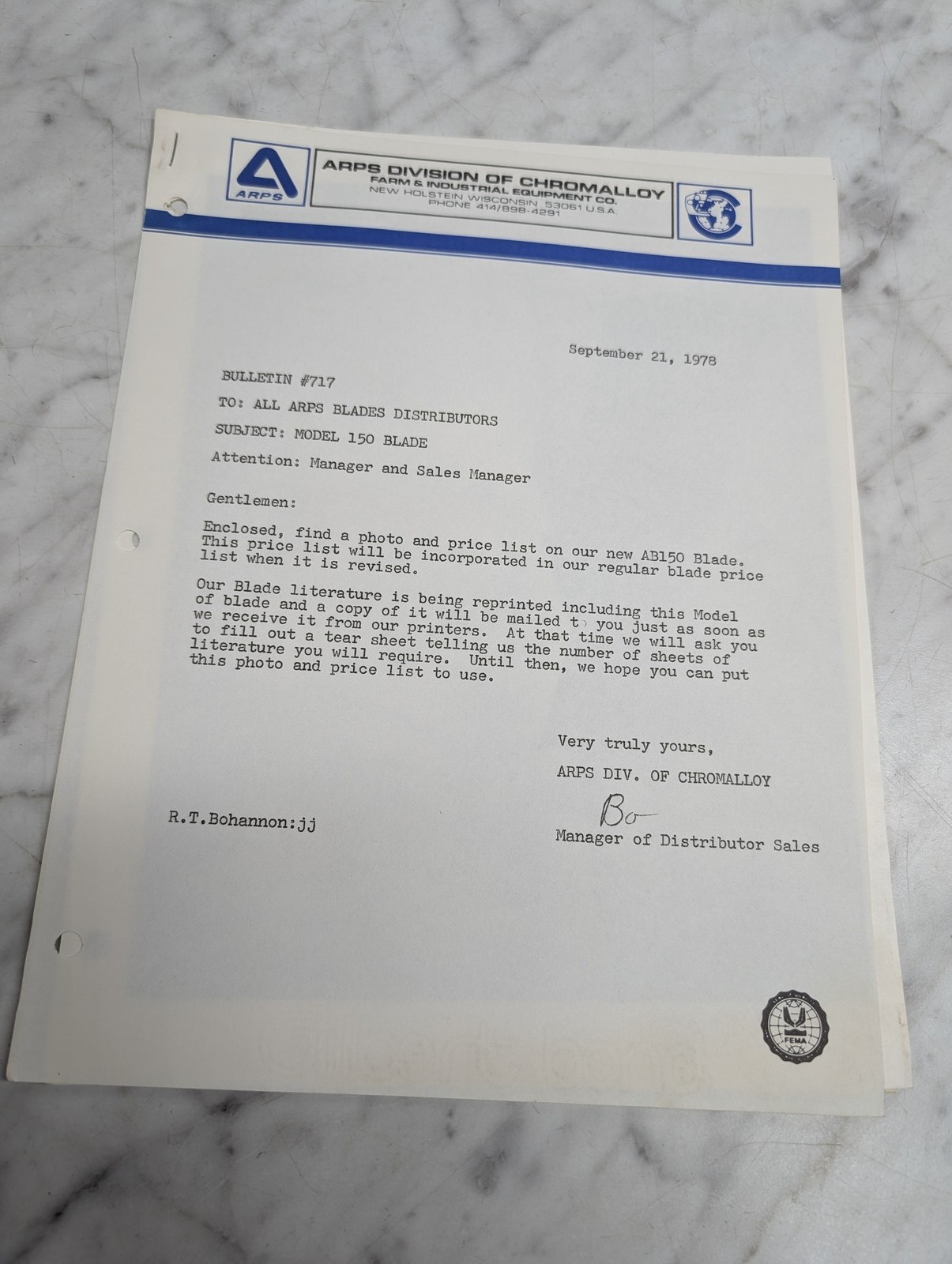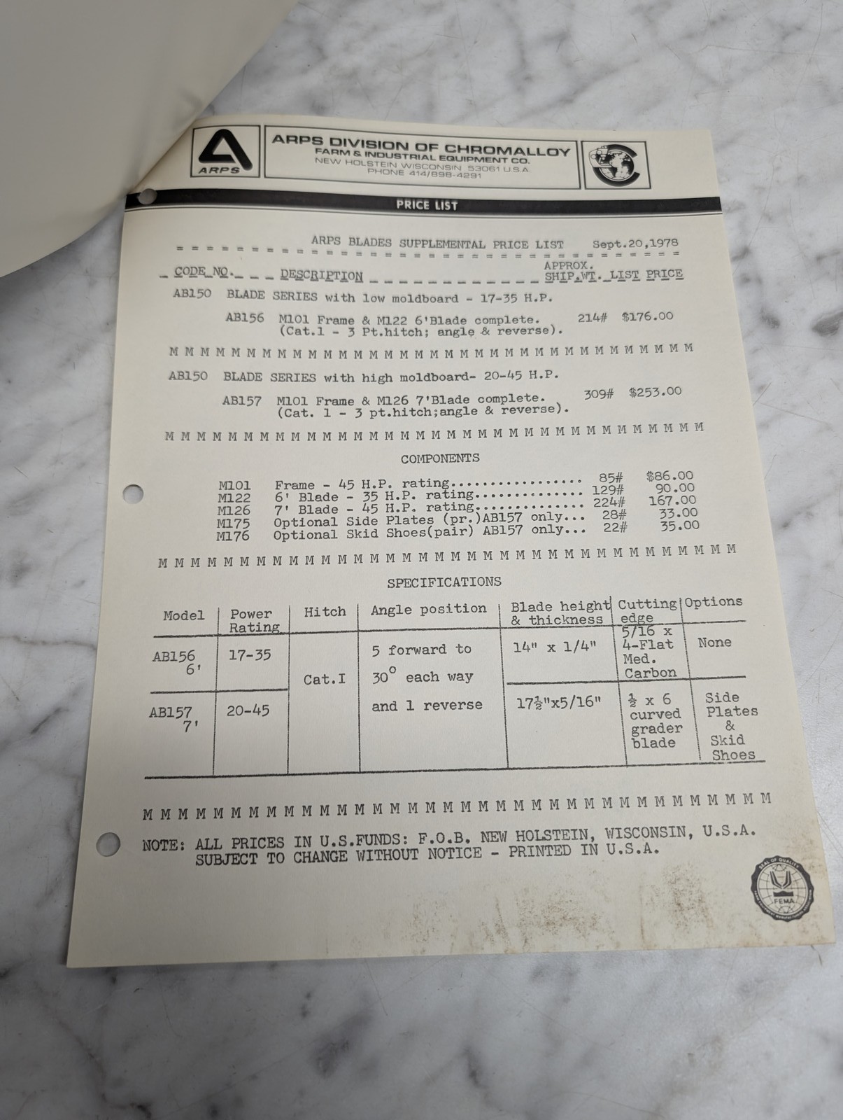 Arps Chromalloy Bulletin 717 Model 150 Blade Price List Ab150 September 21 1978