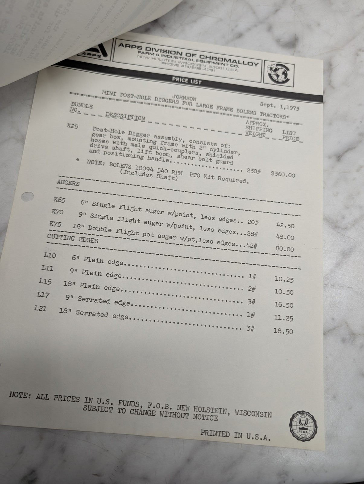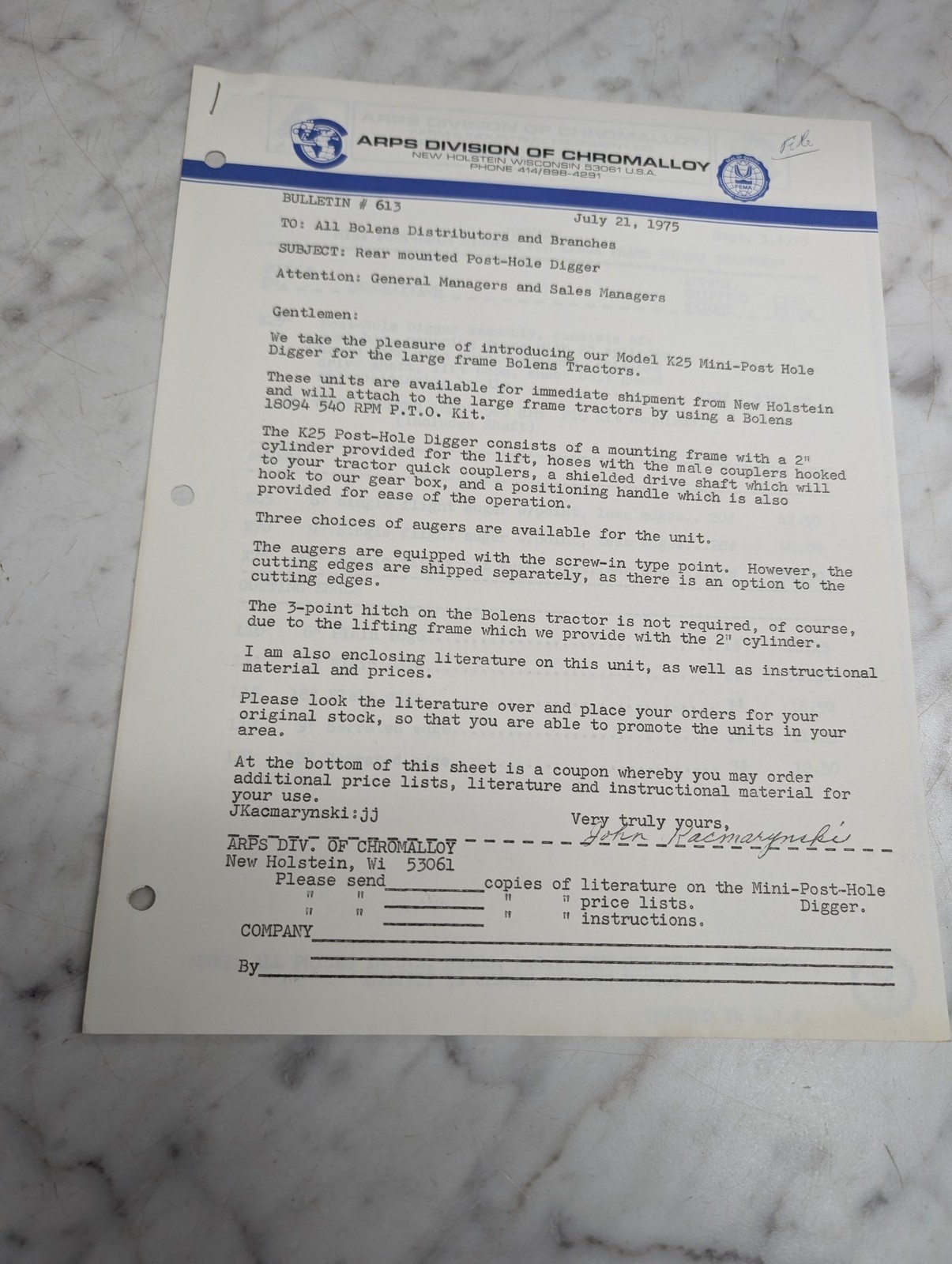 Arps Division Of Chromalloy Bulletin 613 Bolens Model K25 Post Hole Digger