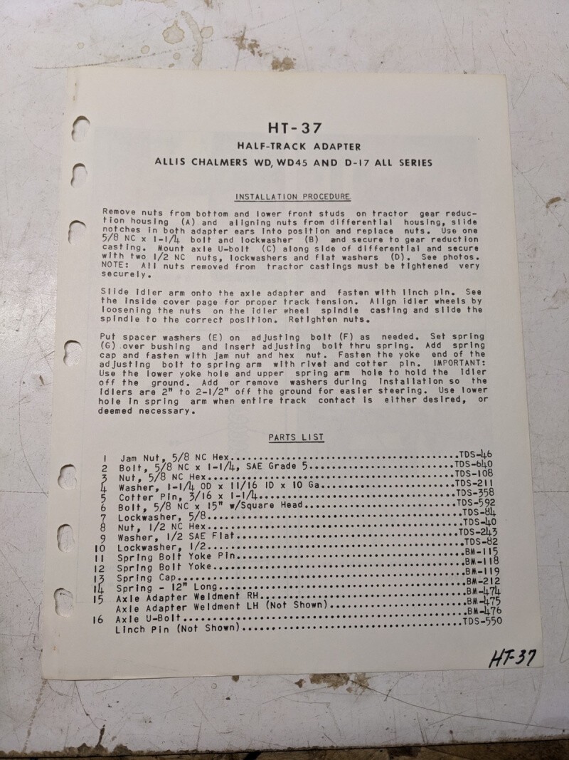 Arps Half Track Adapter Part List Allis Chalmers Wd 45 D17 Tractor Ht-37