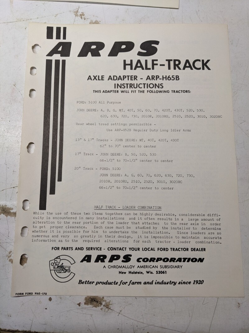Arps Half-Track Axle Adapter Instructions Part List Arp-H65B Ford John Deere