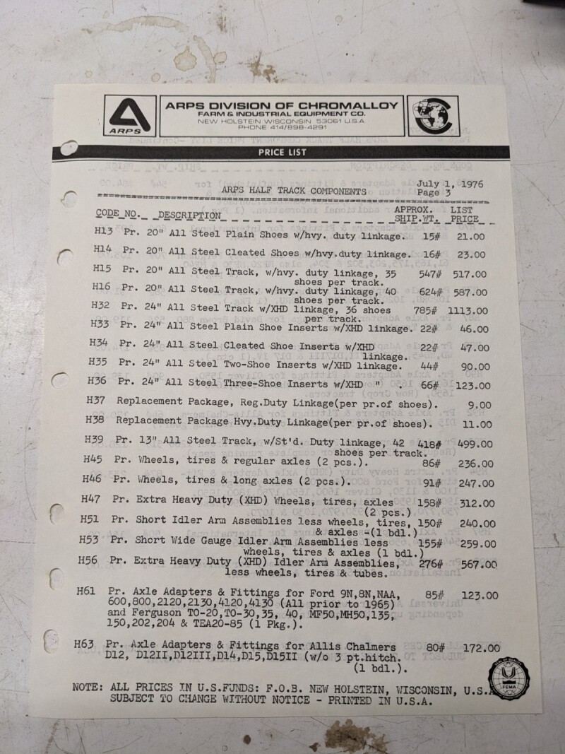 Arps Half Track Components Price List 1976 Page 3 & 4
