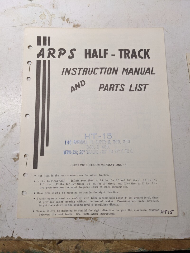 Arps Half Track Instruction Manual Parts List Book Ht-15 Ihc Farmall Super H Htw