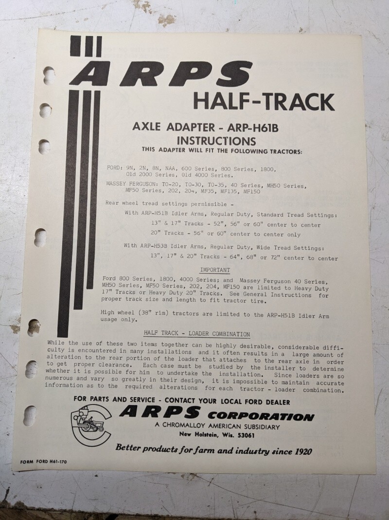 Arps Half-Track Mh 2N 8N Axle Adapter Instructions Part List Arp-H61B Ford Mf