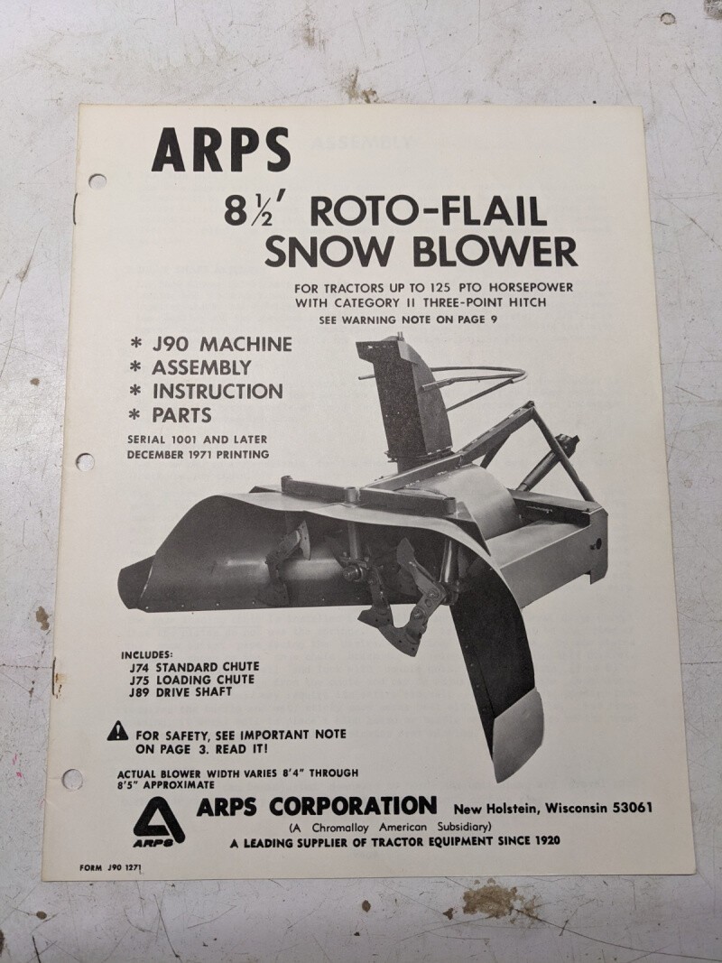 Arps Owners Manual Parts List Book J90 8.5′ Roto-Flail Snow Blower 1271 1971