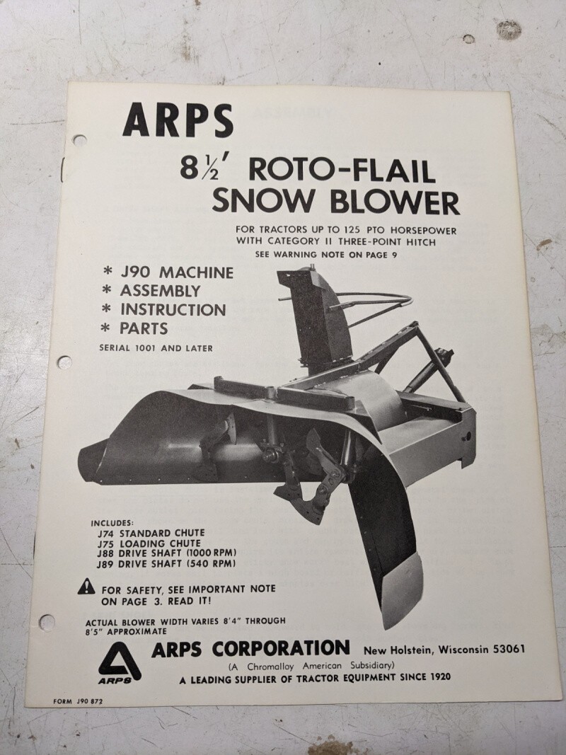 Arps Owners Manual Parts List Book J90 8.5′ Roto-Flail Snow Blower 872