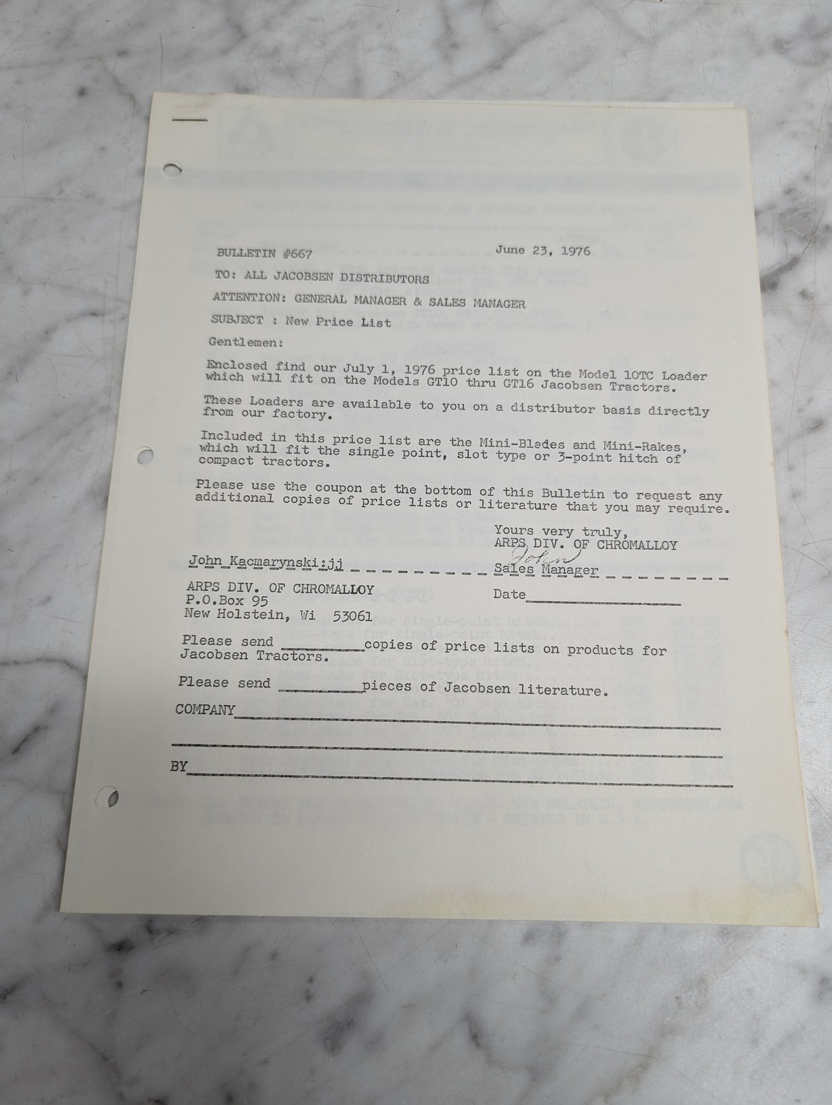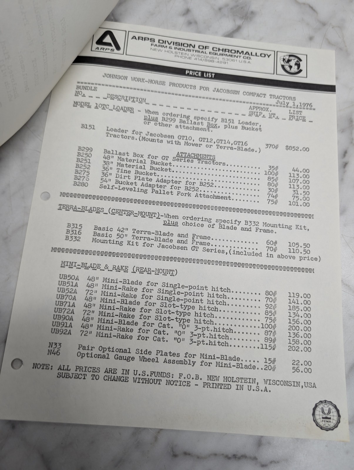 Arps Price List Johnson Work-Horse Jacobsen Compact Tractors July 1 1976