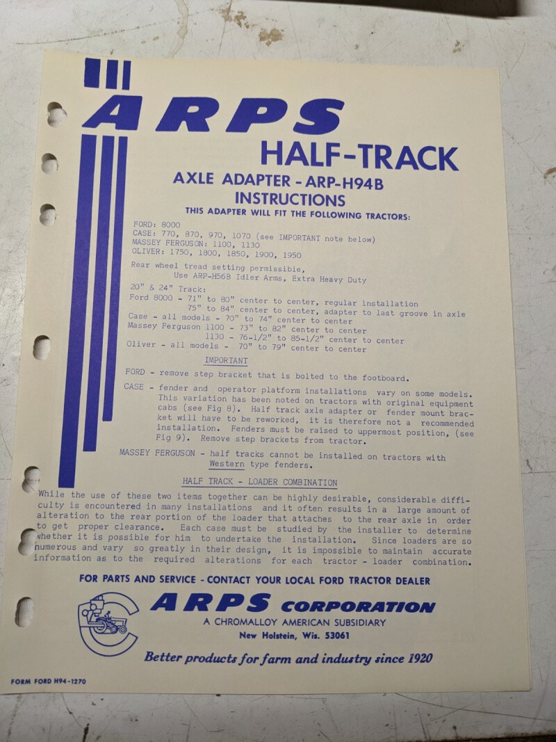 Arps Tractor Half-Track Axle Adapter Instruction Part List H94B Ford Case Massey
