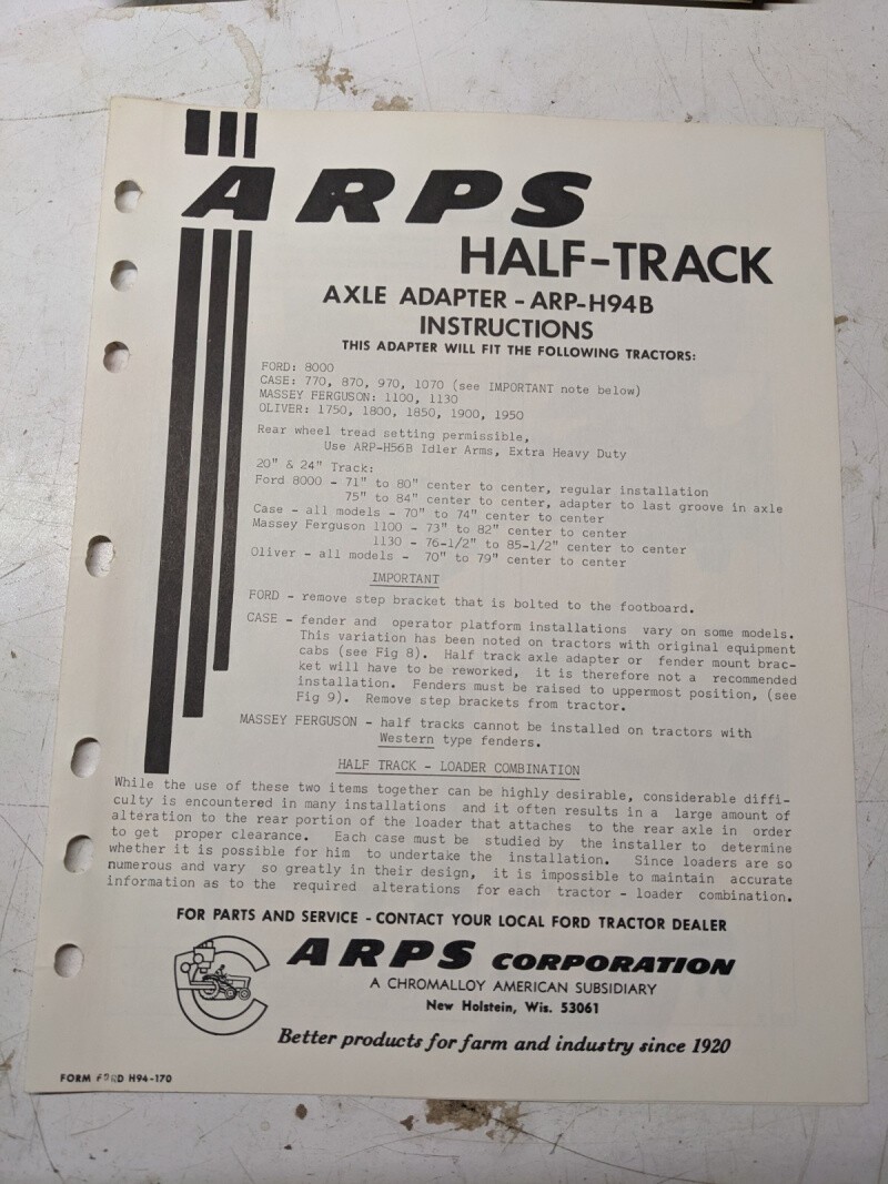 Arps Tractor Half-Track Axle Adapter Instruction Part List H94B Ford Case Oliver