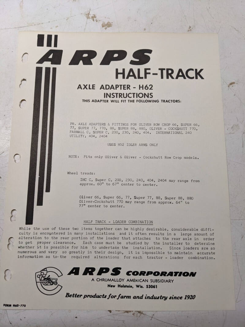 Arps Tractor Half-Track Axle Adapter Instructions Part List H62 Oliver Cockshutt