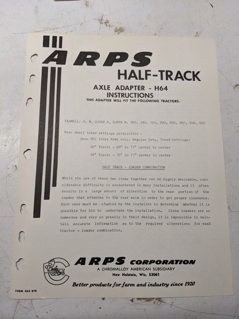 Arps Tractor Half-Track Axle Adapter Instructions Parts List H64 Farmall Super