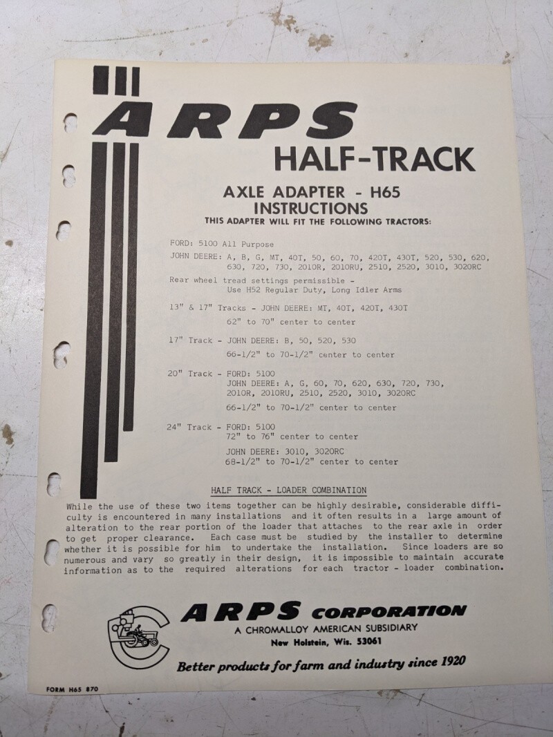 Arps Tractor Half-Track Axle Adapter Instructions Parts List H65 Ford John Deere
