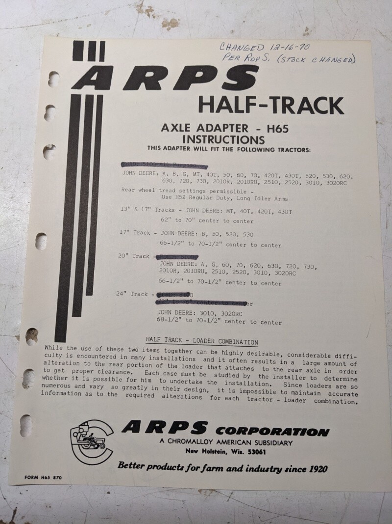 Arps Tractor Half-Track Axle Adapter Instructions Parts List H65 John Deere A B
