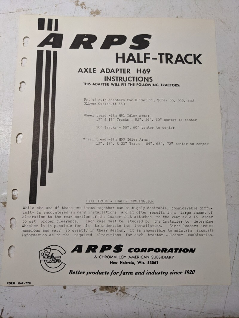 Arps Tractor Half-Track Axle Adapter Instructions Parts List H69 Oliver Cockshut