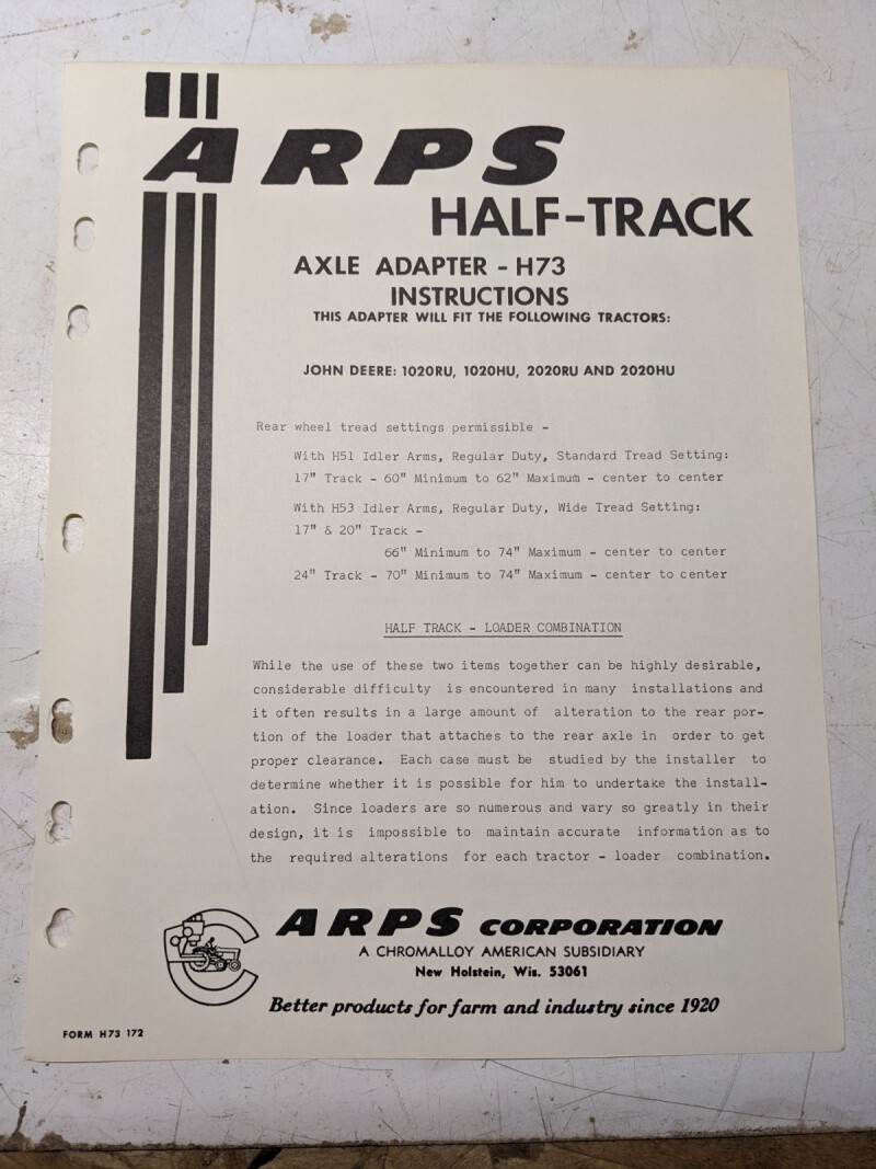 Arps Tractor Half-Track Axle Adapter Instructions Parts List H73 John Deere Jd