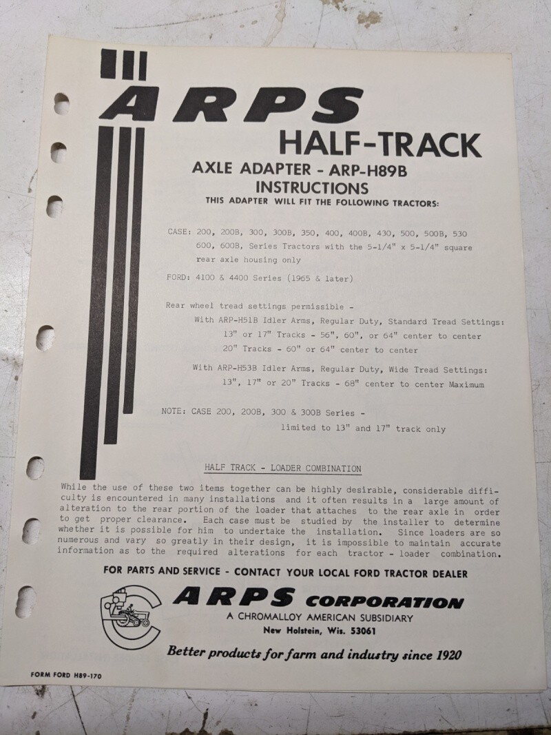 Arps Tractor Half-Track Axle Adapter Instructions Parts List H89B Case Ford