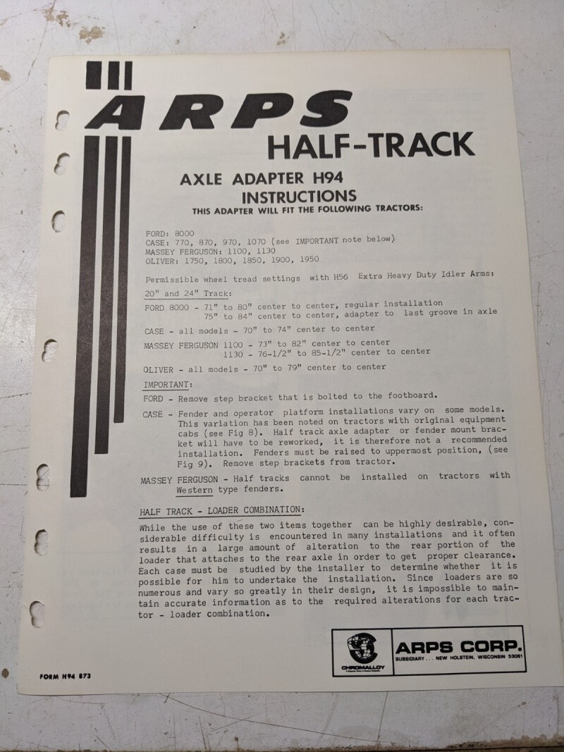 Arps Tractor Half-Track Axle Adapter Instructions Parts List H94 Ford Case Mf