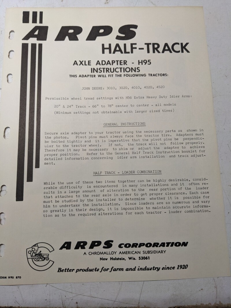 Arps Tractor Half-Track Axle Adapter Instructions Parts List H95 John Deere Jd
