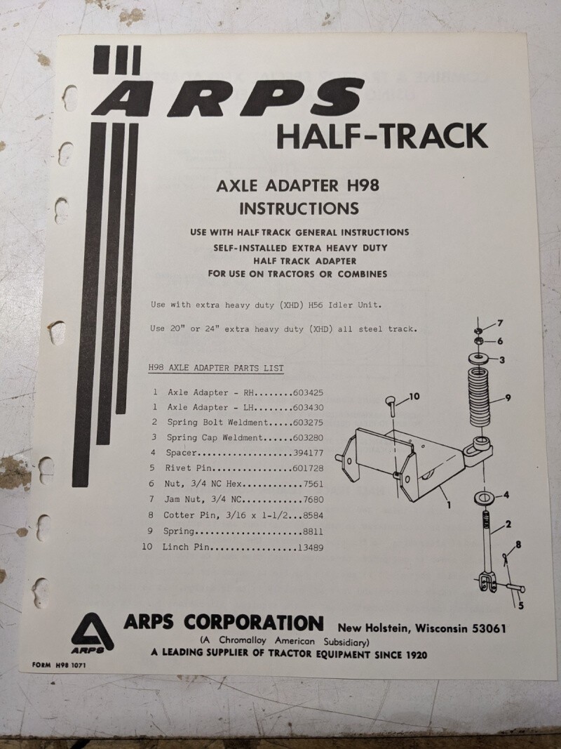 Arps Tractor Half-Track Axle Adapter Instructions Parts List H98 Xhd H56 Idler