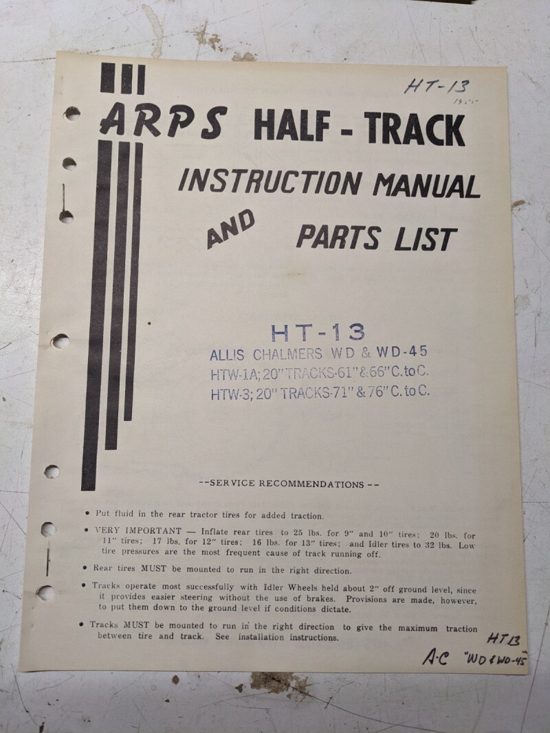Arps Tractor Half-Track Instruction Owner Manual Parts List Allis Chalmers Ht13