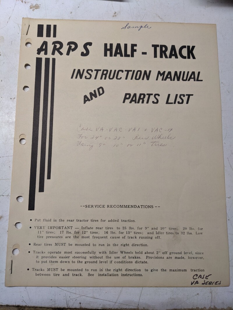 Arps Tractor Half-Track Instruction Owner Manual Parts List Case Va Series