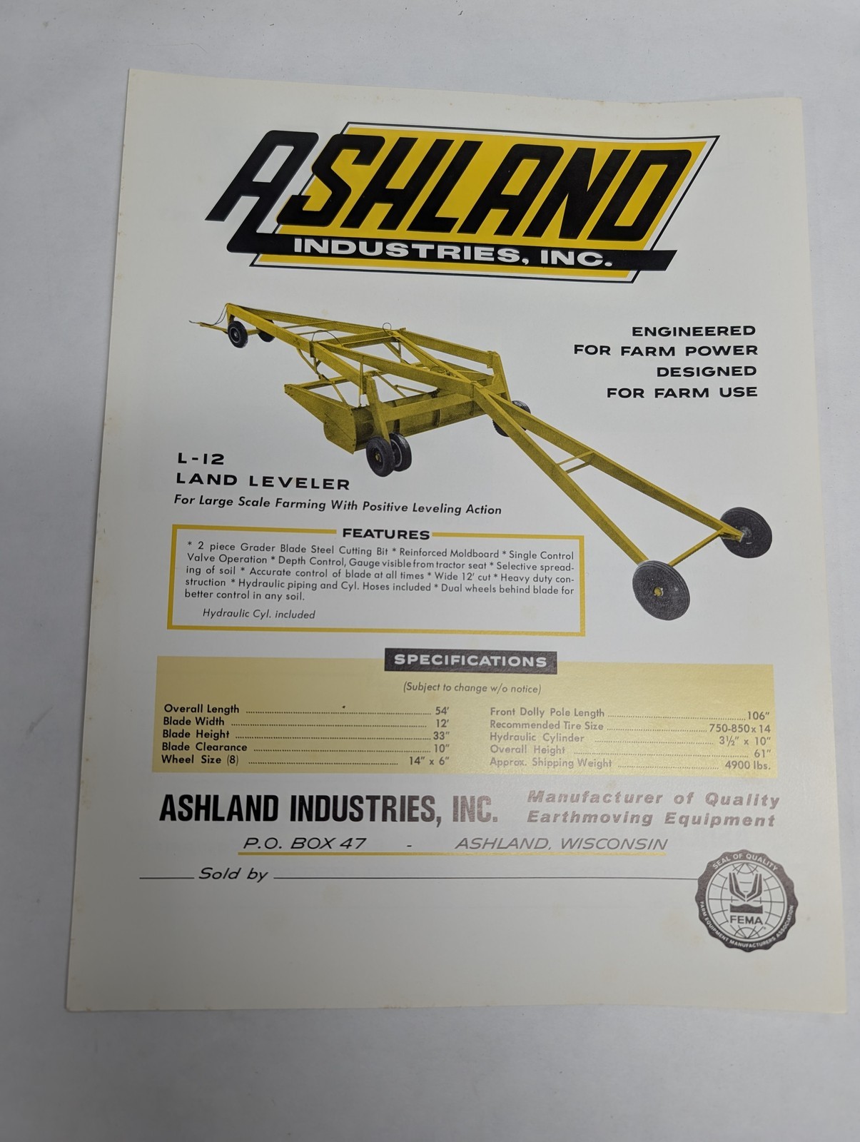 Ashland Industries Sales Sheet Information Specifications L-12 Land Leveler