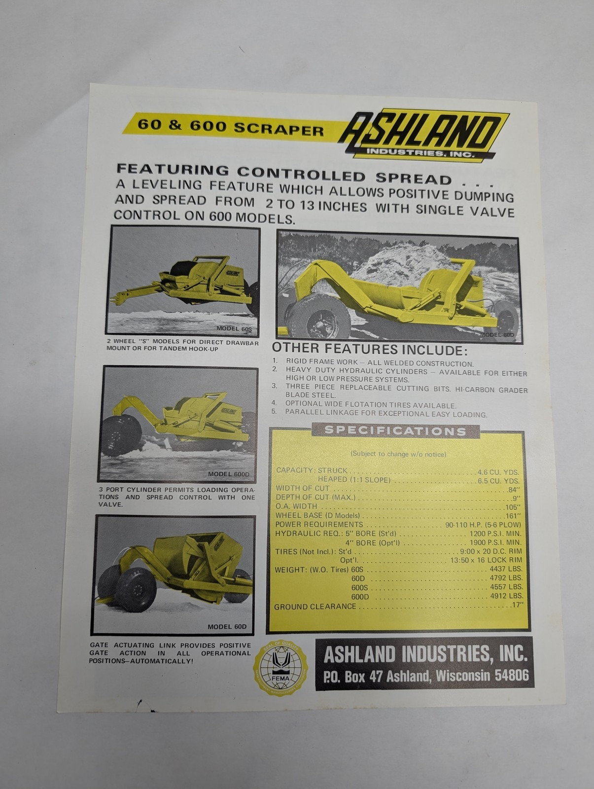 Ashland Sales Sheet 60 600 Scraper & 45 450 Specifications Literature