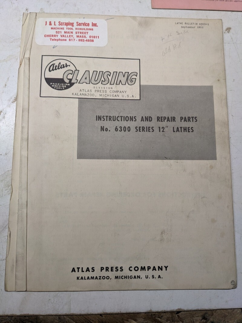 Atlas Clausing Instruction Operator Service Manual Parts List Lathes #6300 12”