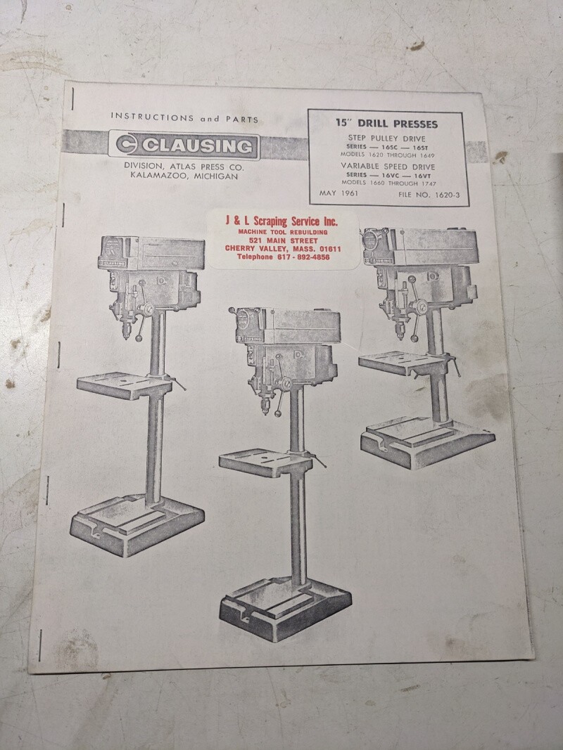 Atlas Clausing Operator Service Manual Parts List 15” Drill 16Sc 16St 16Vc 16Vt