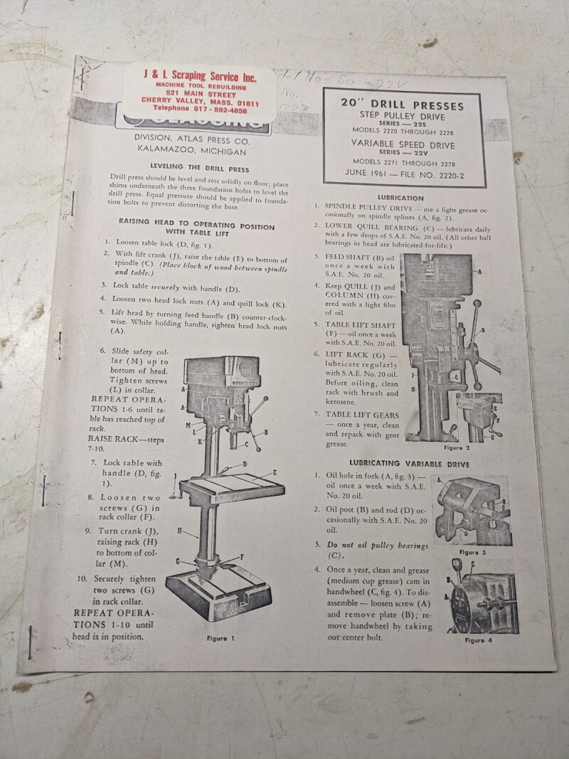 Atlas Clausing Operator Service Manual Parts List 20” Drill Press 225 22V