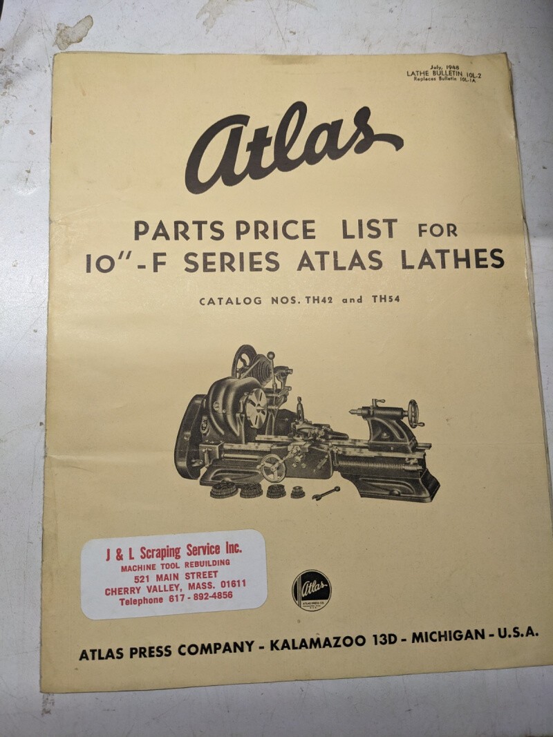 Atlas Service Parts Price List Manual 10” F Series Lathes Th42 Th54 1948