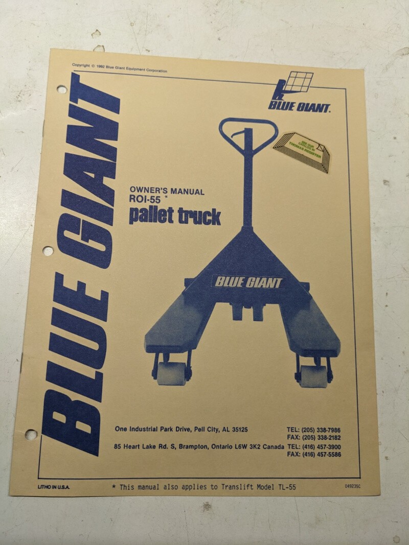 Blue Giant Owners Manual Maintenance Parts List Book Catalog Roi-55 Pallet Truck
