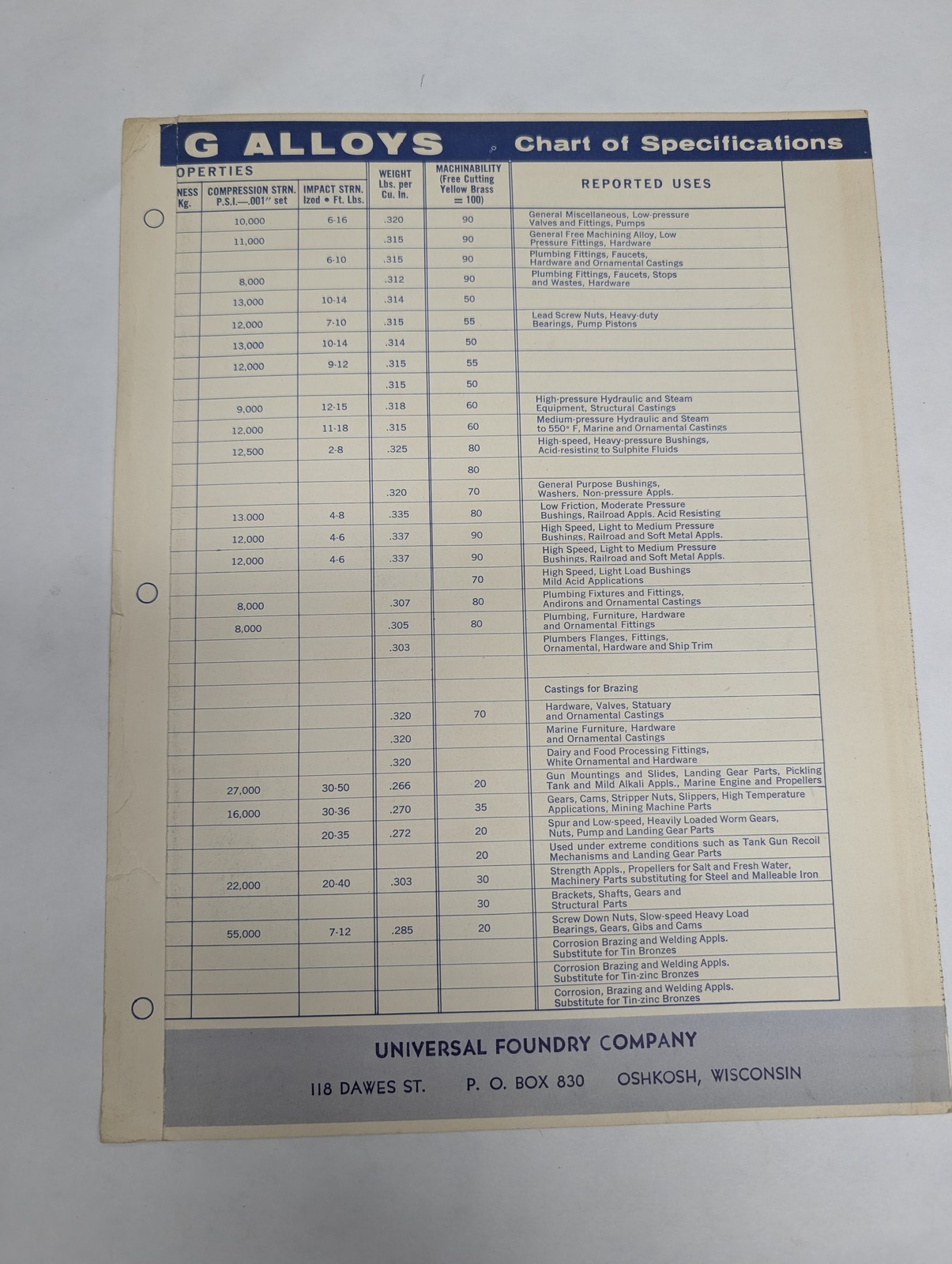 Brass & Bronze Standard Casting Alloys Chart Of Specifications Universal Foundry