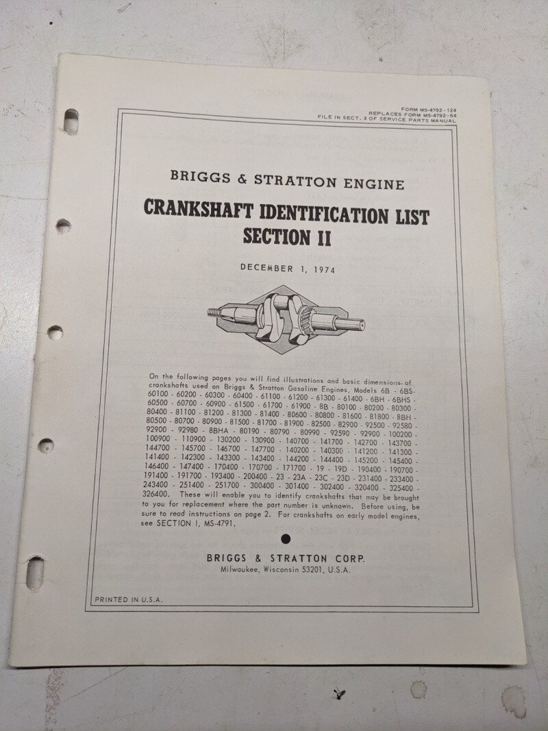 Briggs & Stratton Crankshaft Identification List Section 2 1974 Dimensional Data
