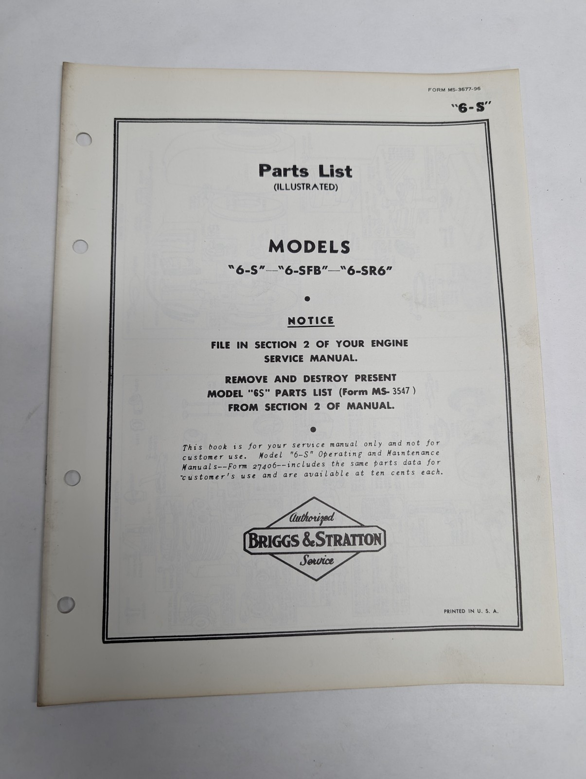Briggs & Stratton Engine Illustrated Parts List Catalog Manual 6-S Ms-3677