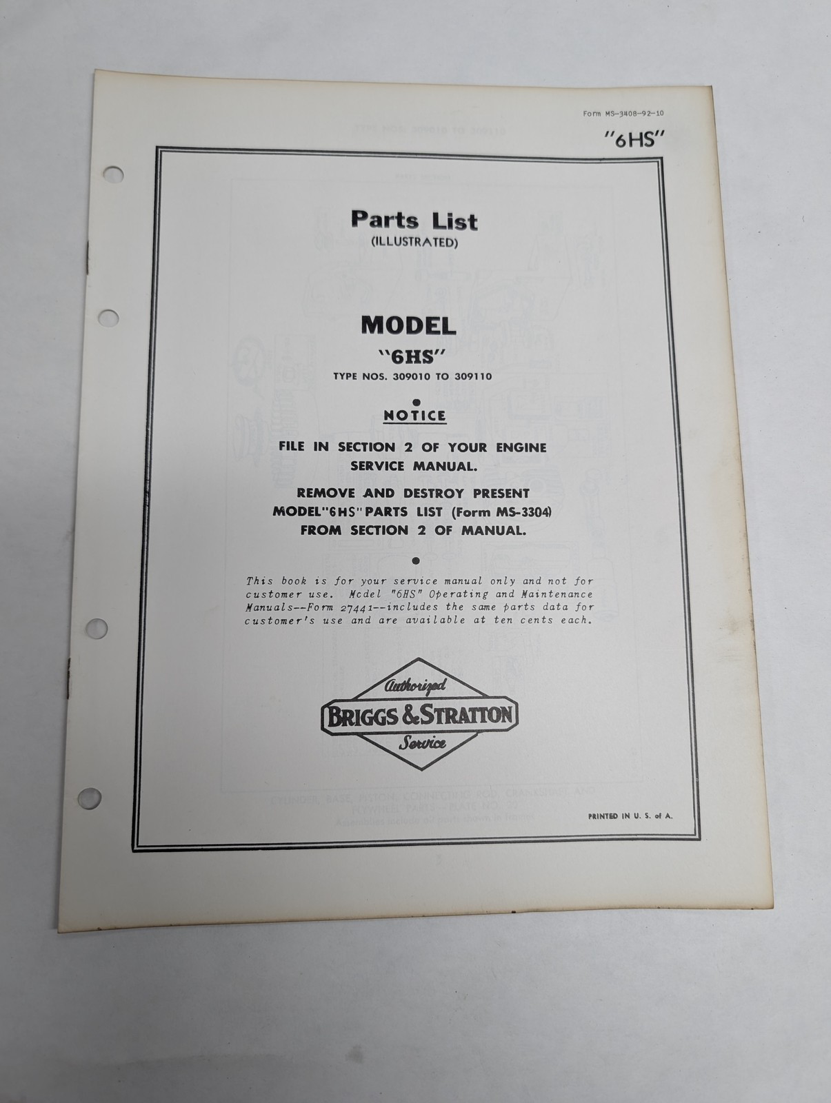 Briggs & Stratton Engine Illustrated Parts List Catalog Manual 6Hs Ms-3408