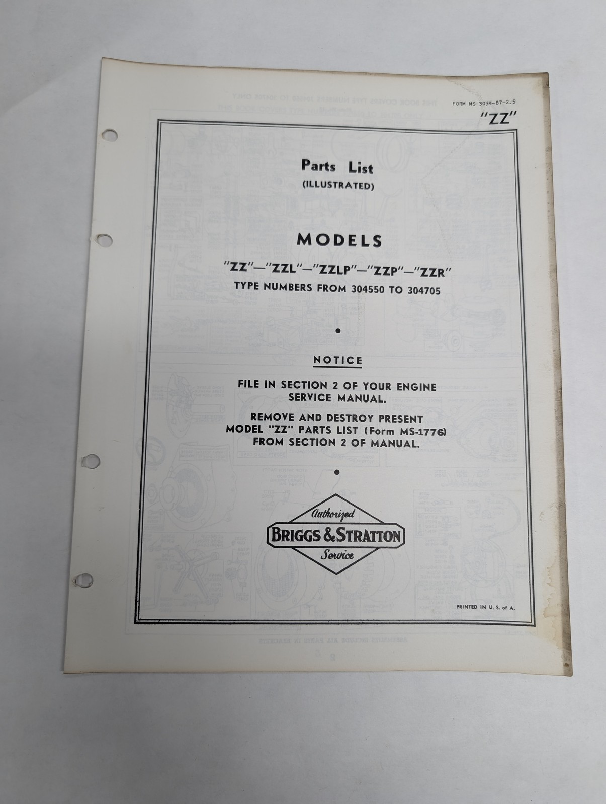 Briggs & Stratton Engine Illustrated Parts List Catalog Manual Zz Ms-3034