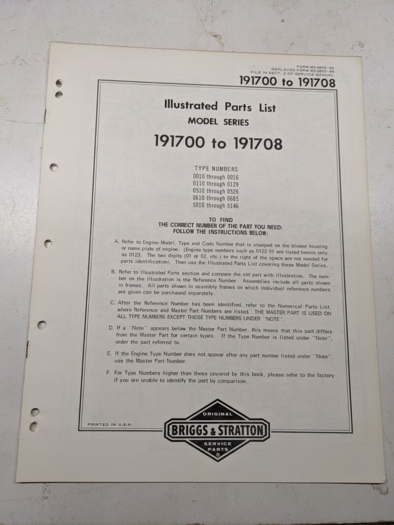 Briggs & Stratton Illustrated Engine Repair Parts Book Manual 191700-191708