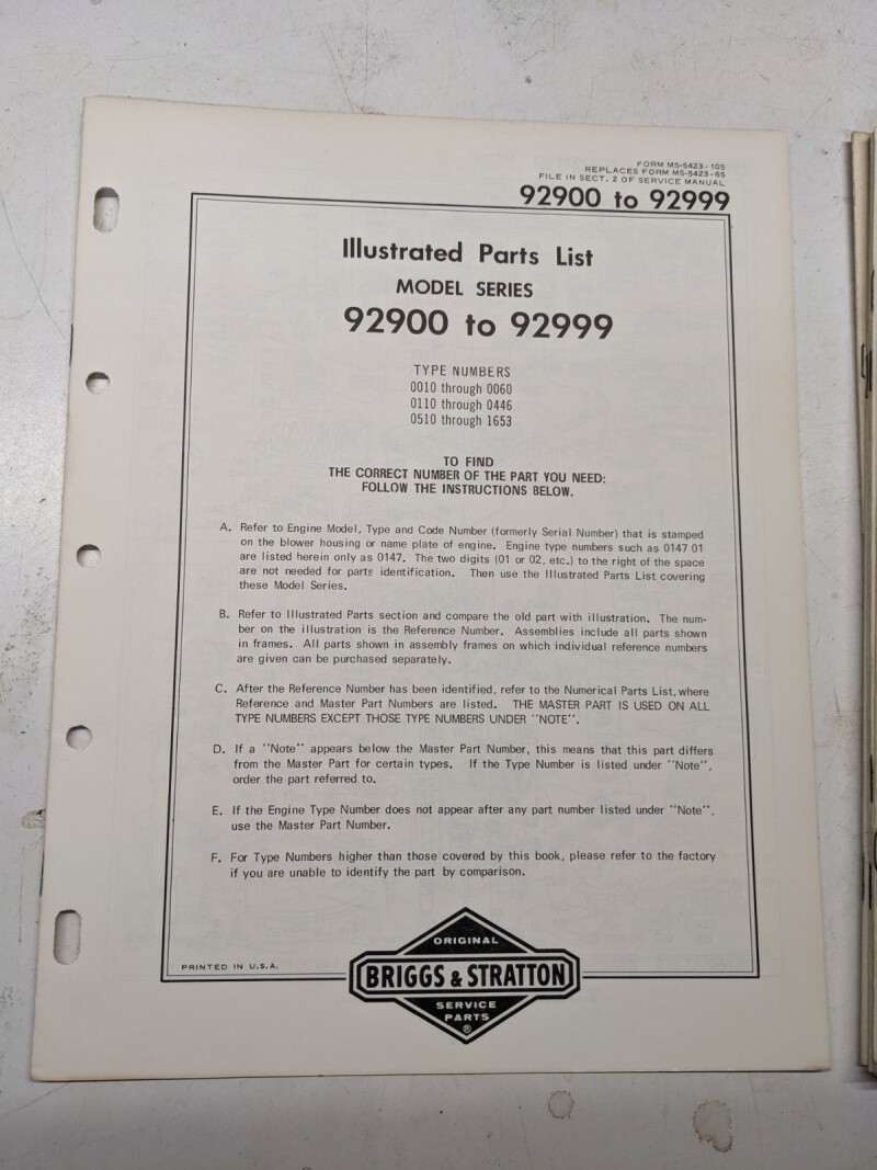 Briggs & Stratton Illustrated Engine Repair Parts Book Manual 92900-92999