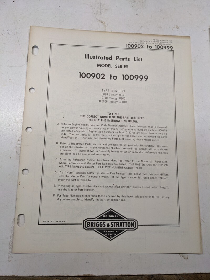 Briggs & Stratton Illustrated Engine Repair Parts List Book Manual 100902-100999