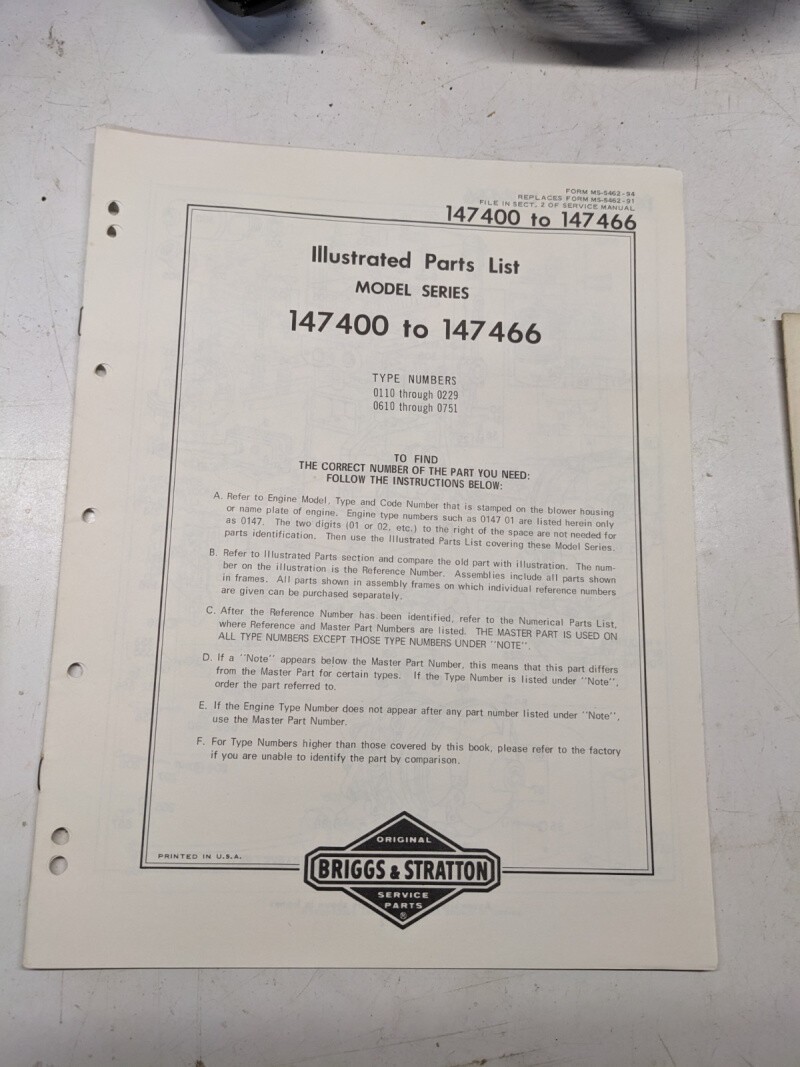 Briggs & Stratton Illustrated Engine Repair Parts List Book Manual 147400-147466