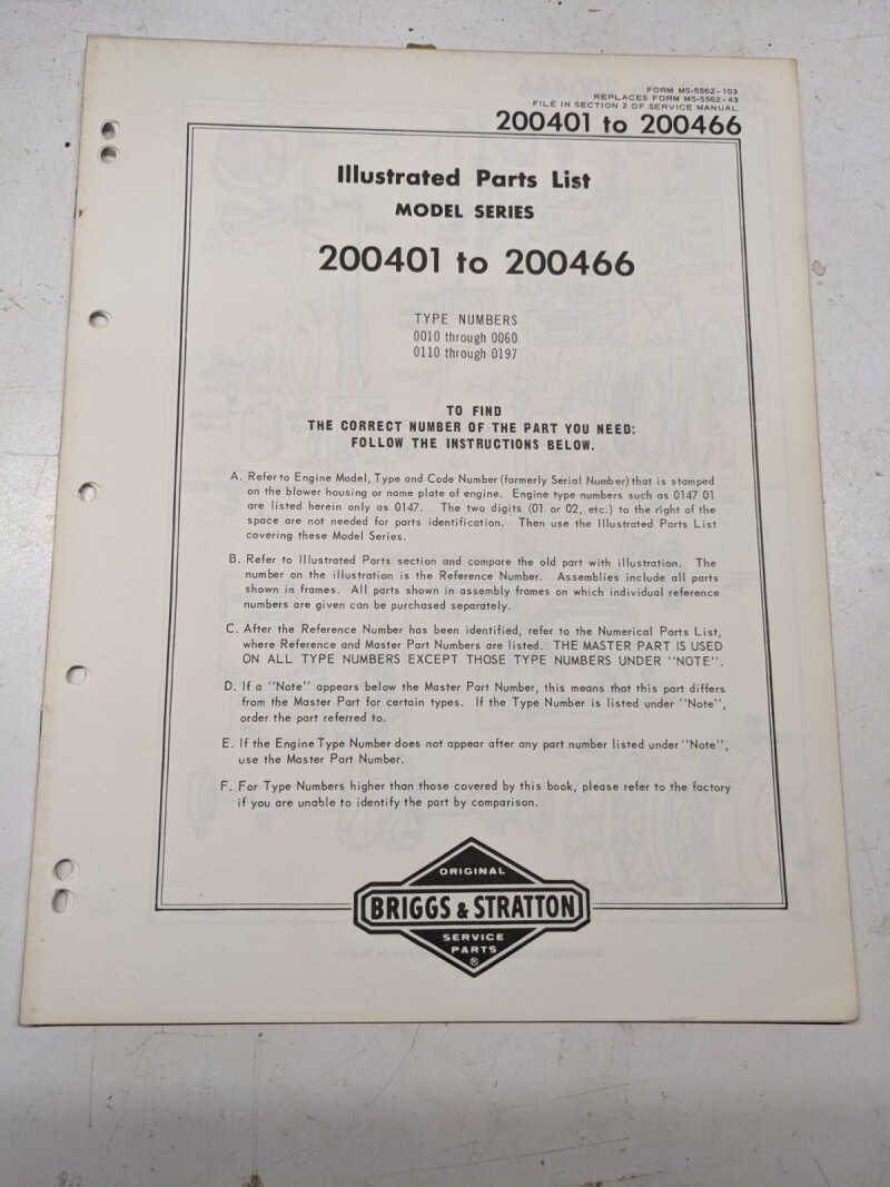 Briggs & Stratton Illustrated Engine Repair Parts List Book Manual 200401-200466