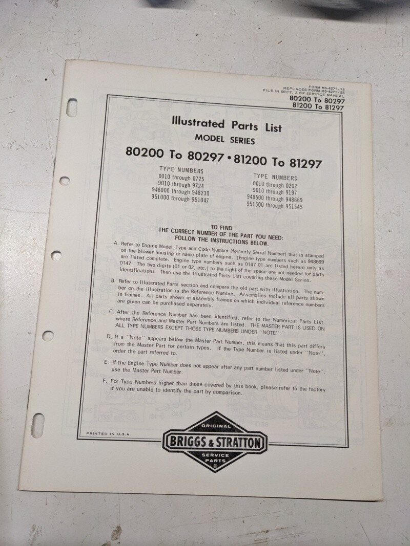 Briggs & Stratton Illustrated Engine Repair Parts List Book Manual 80200 81200